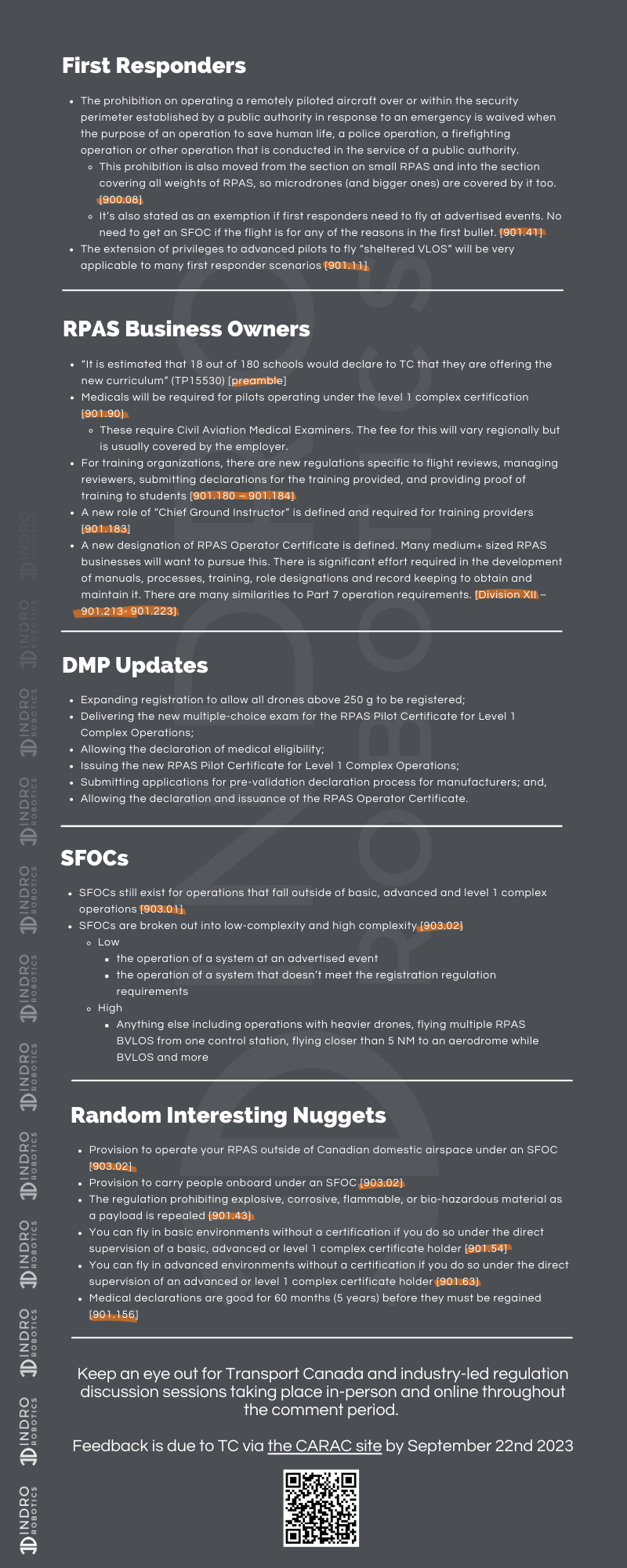 Below: These graphics, pulled together by Kate Klassen and InDro, cover key aspects of the anticipated new RPAS regulations