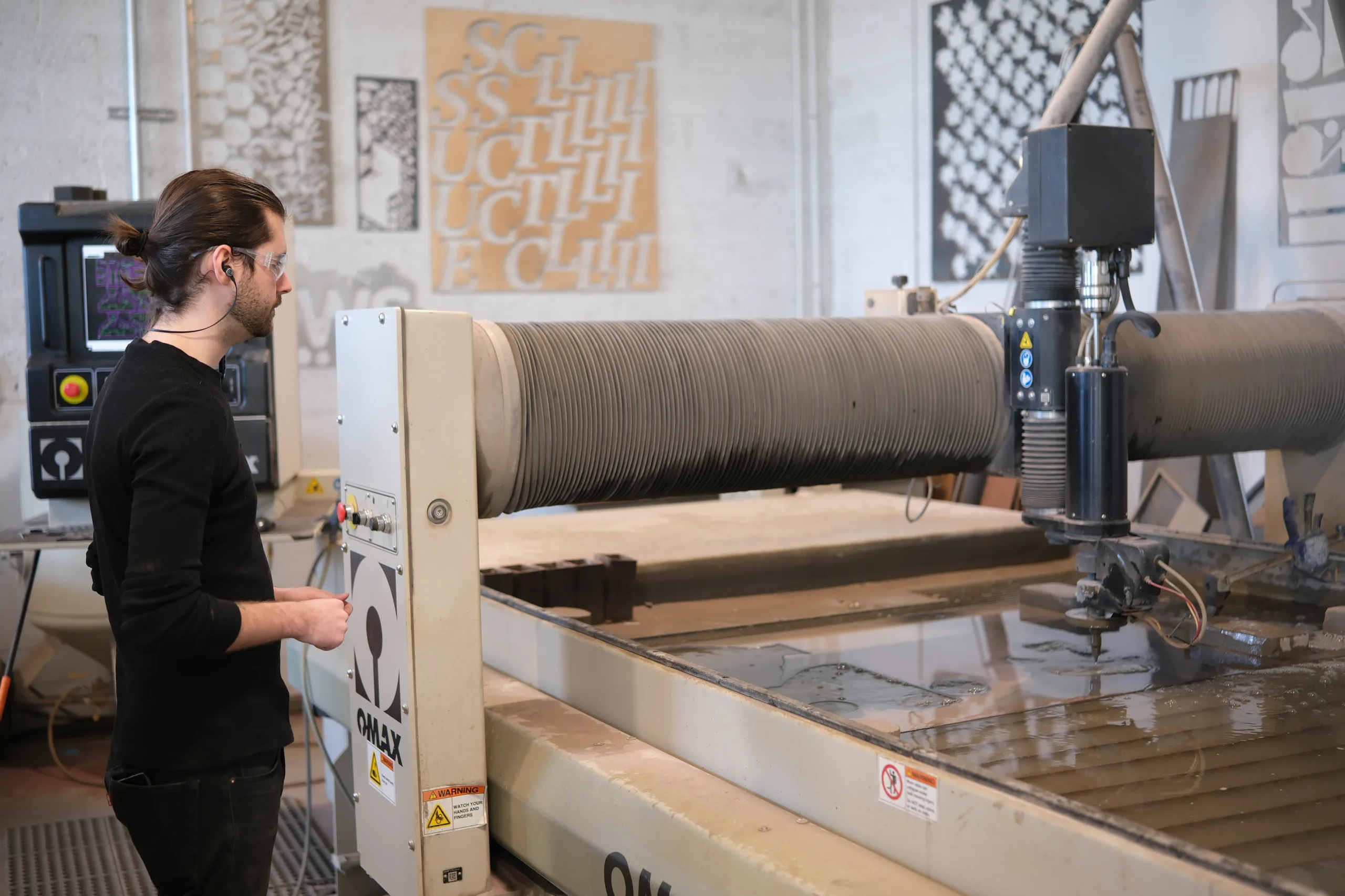 Below: Production Engineer Stephan Tzolov operates the facility’s OMAX water jet table, which can slice through metal and other materials using a focussed, high-pressure slurry. Photo by Scott Simmie